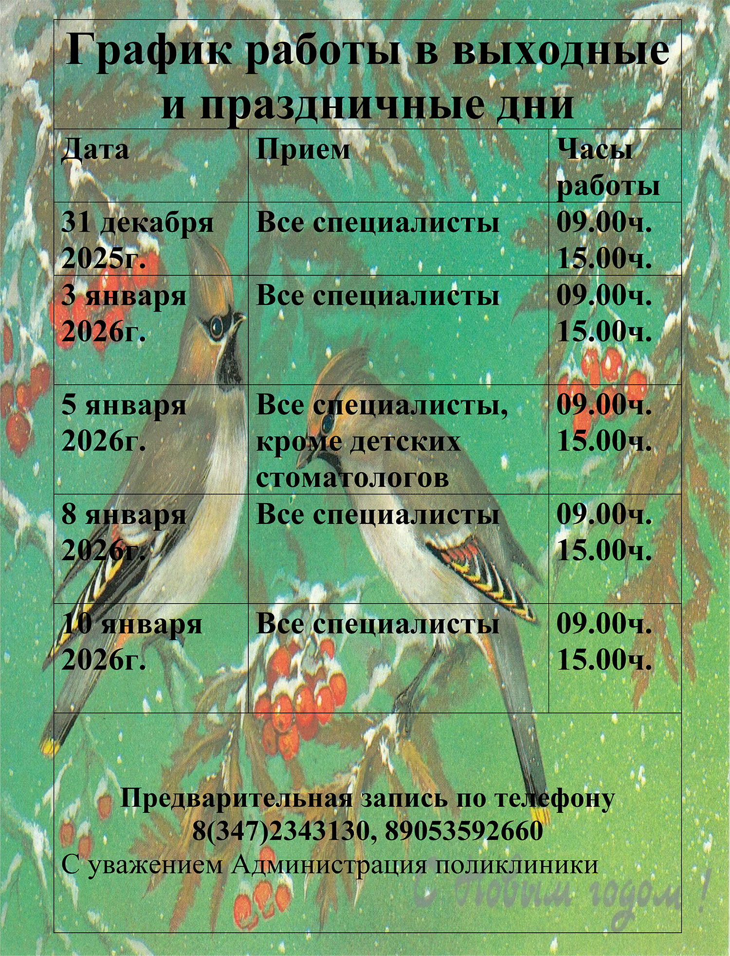 ГРАФИК РАБОТЫ с 31 декабря 2025 г. по 10 января 2026г.